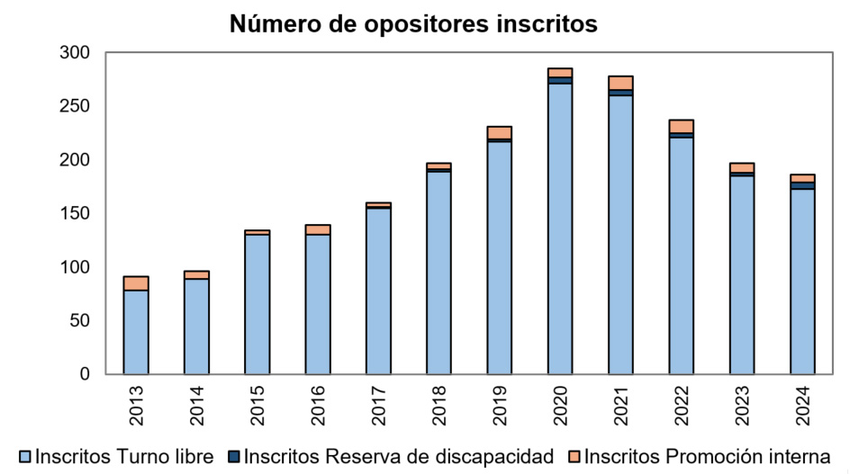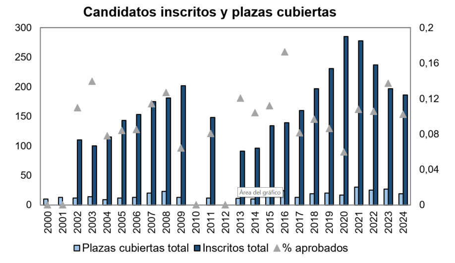 Desde 2009, dentro del turno libre, la ratio entre los candidatos inscritos y las plazas cubiertas osciló entre el 6 y el 12 %, si bien para las convocatorias de 2016 y de 2023 fue mayor (18 % y 15 %, respectivamente).