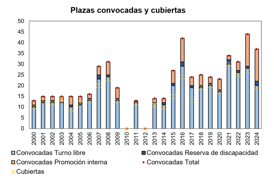 En el período de 2009-2013 se convocaron un promedio de 7,4 plazas de turno libre, entre 0 y 5 de promoción interna y un máximo de 2 de reserva por discapacidad.