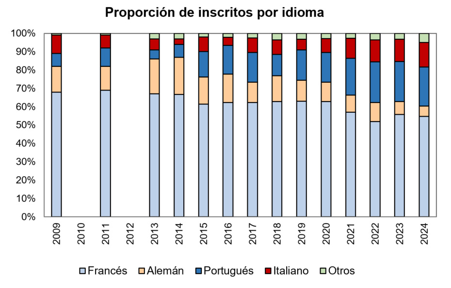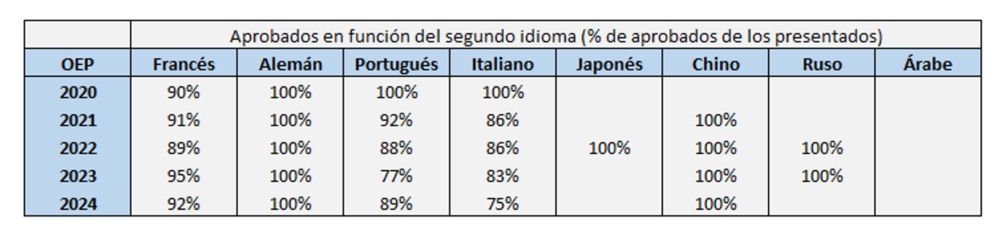 Desde la OEP 2020 se ofrece el desglose de los aprobados por idioma, lo que permite analizar cuál es el porcentaje de aprobados del segundo idioma en función del idioma que presentan. Se puede observar que, en las últimas convocatorias, todos los opositores que aprobaron inglés y presentaron alemán, japonés, chino o ruso aprobaron también el segundo idioma, mientras que los suspensos del segundo idioma se concentran en francés, portugués e italiano. En el caso de italiano se observa una tasa decreciente de aprobados desde 2020.