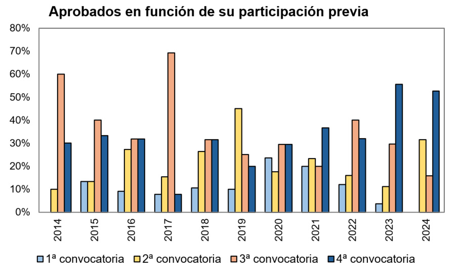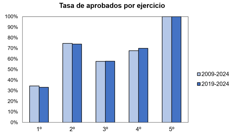 En las últimas convocatorias se observa una menor tasa de aprobados en el primer ejercicio y una mayor tasa de aprobados en el cuarto ejercicio.